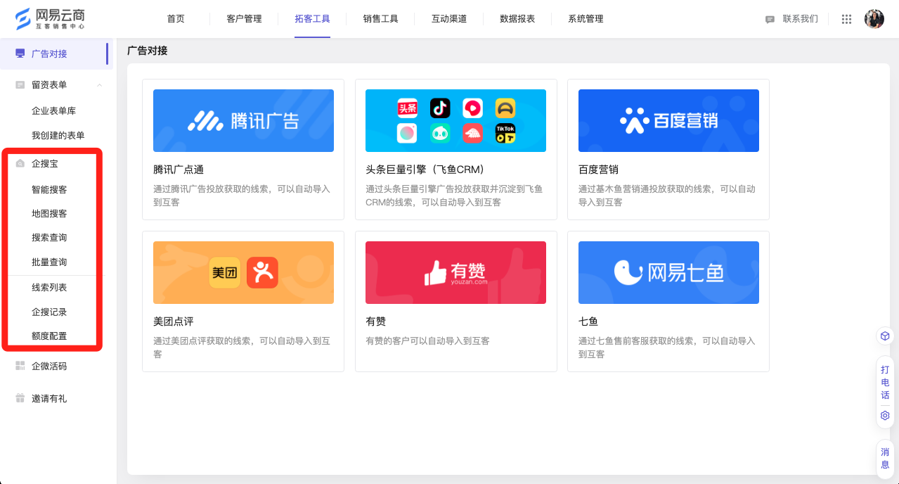 企业怎样精准获客?现如今的时期是互联网技术 营销时代,也是互联网大数据 营销时代,伴随着互联网大数据深层运用、营销推广的人工智能技术化、工业生产生产制造的紧密结合、全新升级的內容互动方式、人和设备的互连、设备与设备的互连等新起技术应用的盛行,企业要做的便是不断进取作出更改依靠新专用工具、新技术应用、新办法来解决现在的窘境。网易互客企搜宝获客系统,是一款中国领跑的智能营销获客系统软件,专注于利用互联网大数据、人工智能技术B2B企业精准获客,处理“寻找客户-通电话-销售线索过虑”等获客难题,助推B2B企业节约人工和获客成本费。网易互客企搜宝获客系统服务平台包含销售线索获得、跟踪、转换与存留等阶段,可协助B2B企业完成对销售线索的精益化管理,且适用PC 挪动系统软件线上与线下办公协同,此后道别企业內部信息不对称。