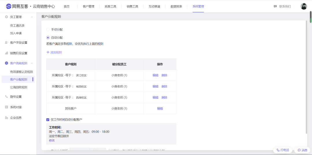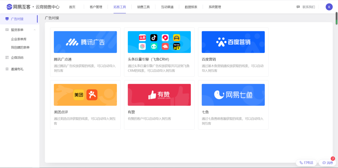 广告平台一键授权互客,实现自动对接美团、抖音等平台,学员在美团、抖音预留的信息会统一全部汇总到互客中,并自动按照地理位置等分配给不同门店的课程顾问,实现自动对接流转。避免人工导入导出。