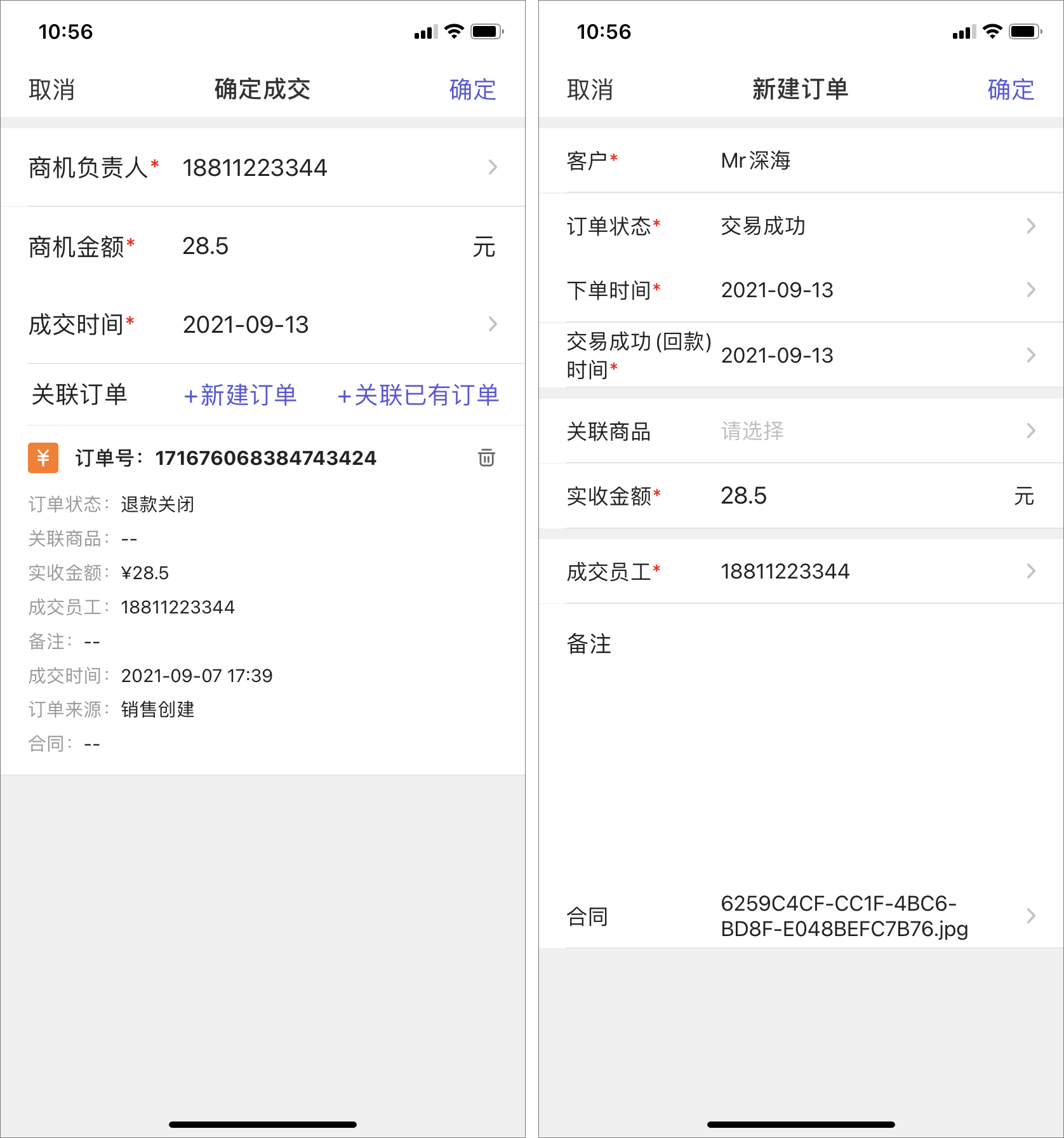 APP端在商机成交页面新建订单时,也支持添加自定义字段了。