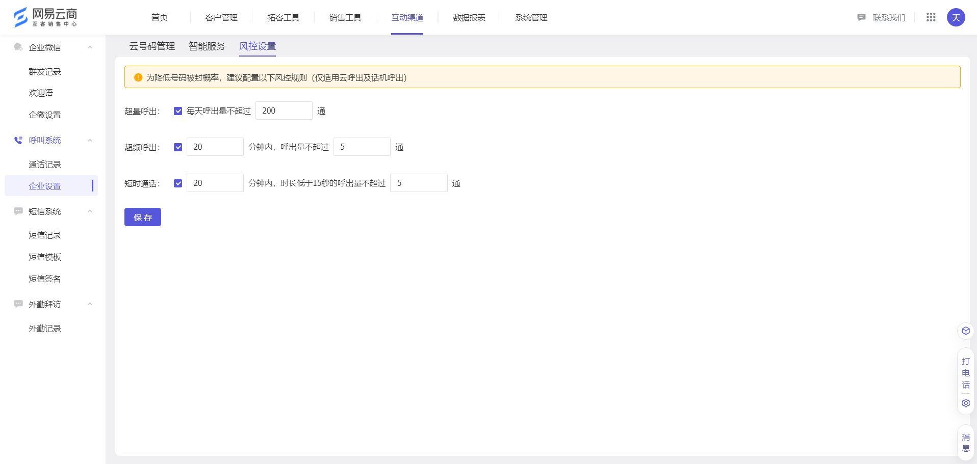 为了降低号码被封的概率,我们增加了外呼的风控规则设置