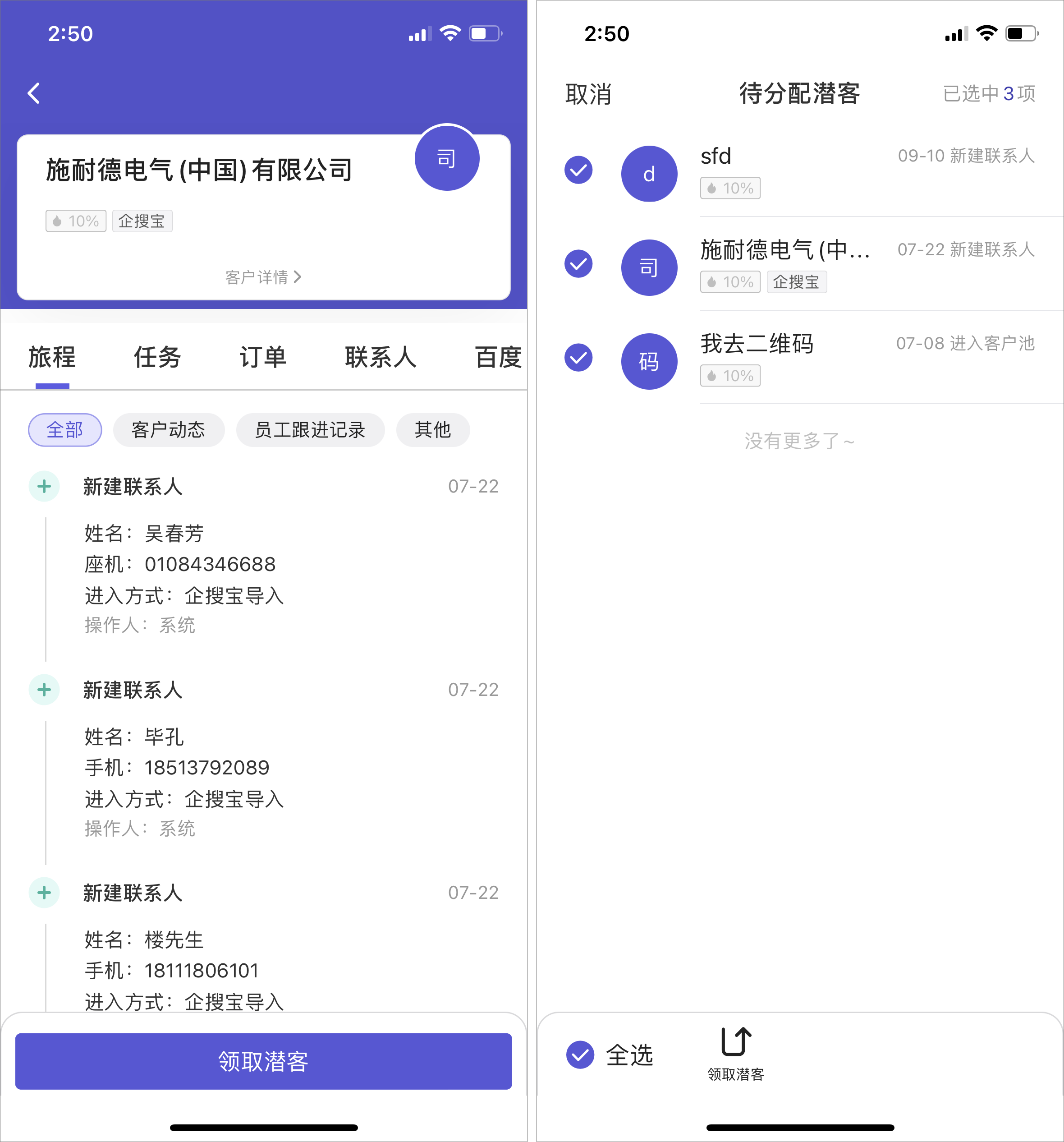 跟进中潜客池:展示有员工正在跟进的潜客。