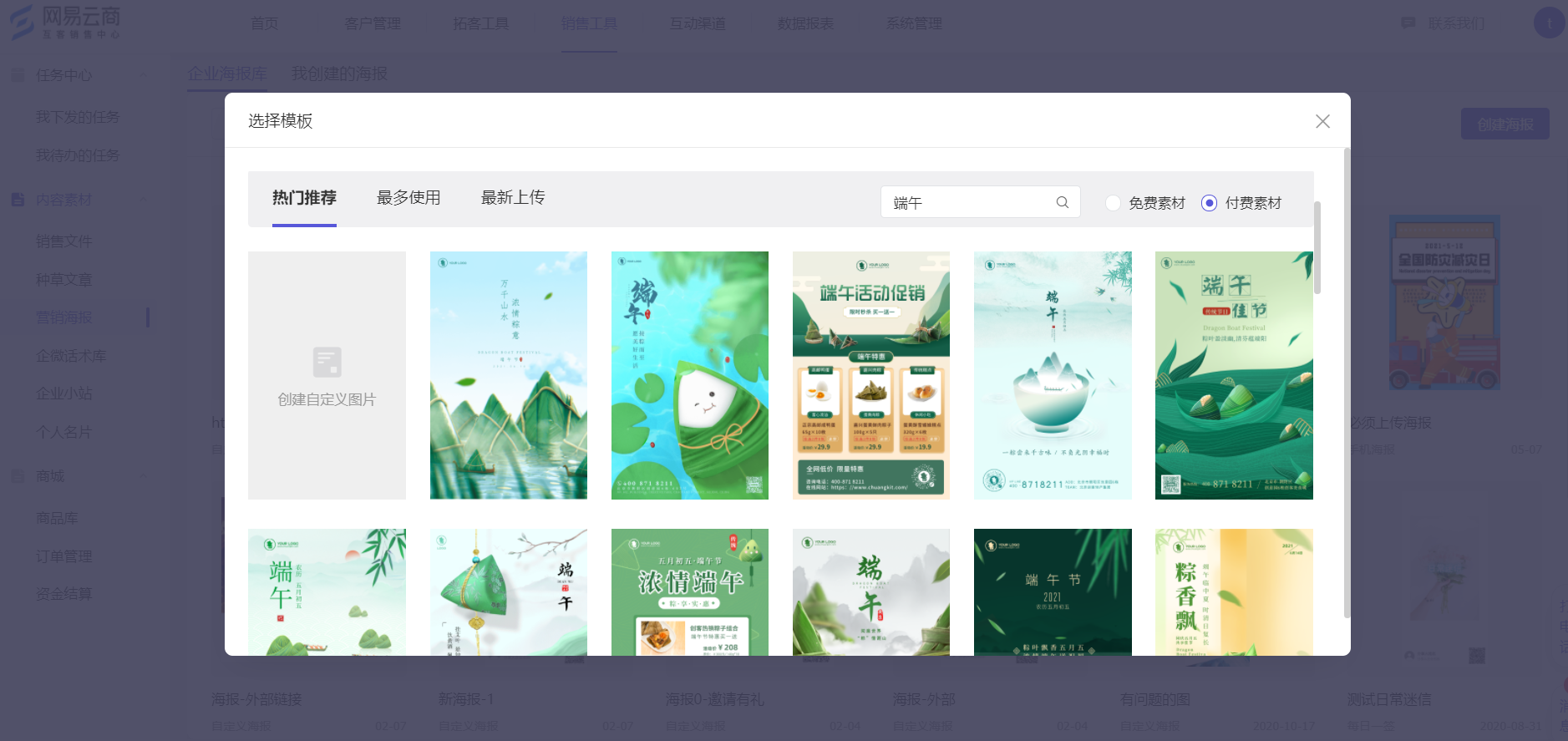 互客销售工具-内容素材中,种草文章、营销海报、企业小站模块,以及商城的商品库模块中使用到图片素材之处,均支持图片素材的搜索功能: