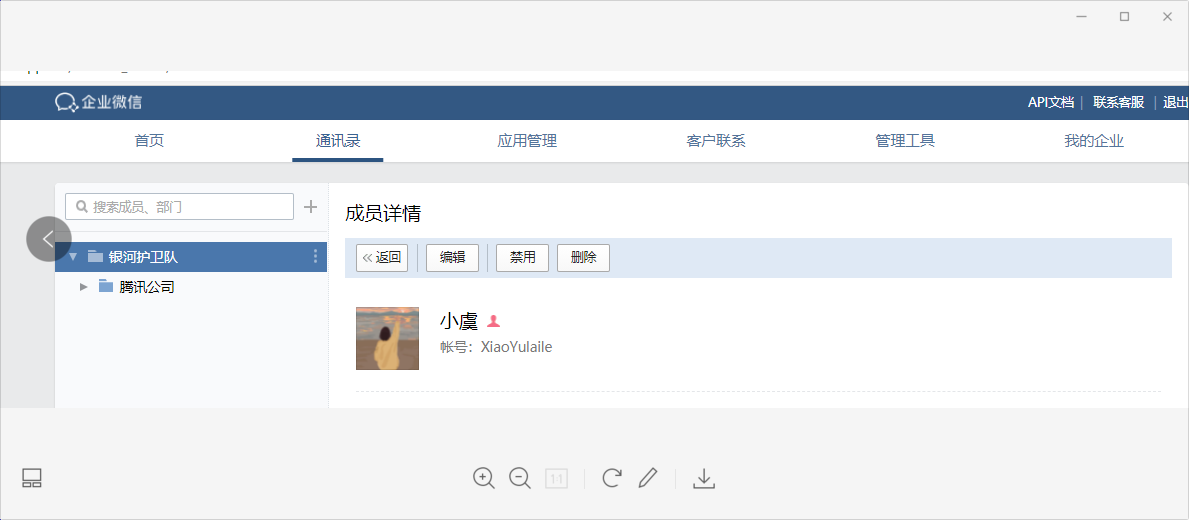 此处需要输入的是企业微信账号,可由企业微信管理员在企业微信后台通讯录中查询: