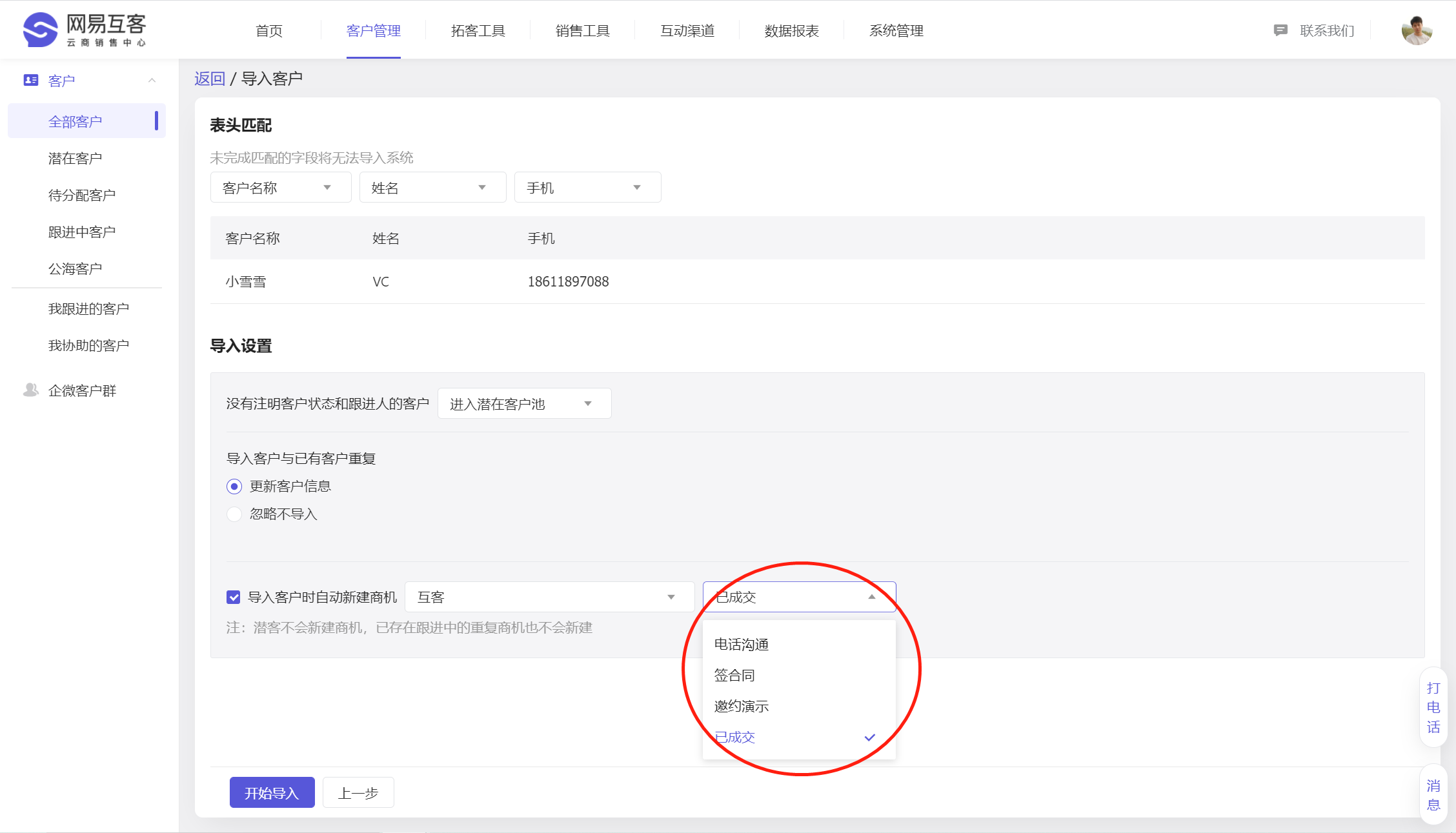 比如你需要导入一批“已成交”的客户,则可以选择导入后新建商机的默认跟进阶段为”已成交”。