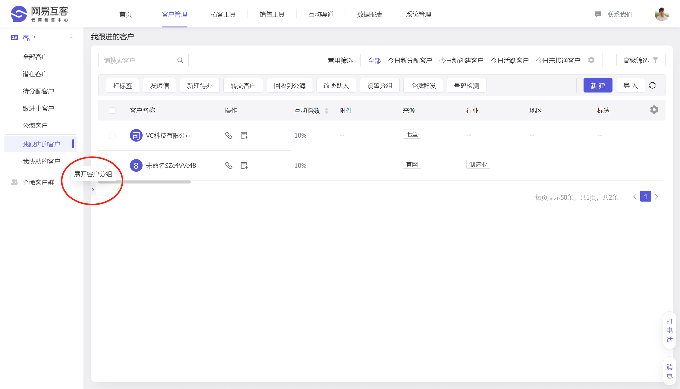 在“我跟进的客户”,点击【左侧】的小箭头展开客户分组,可以发现这个彩蛋功能哦。